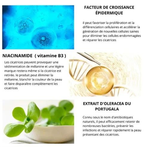 Effets : Réparation de la peau / Élimination des cicatrices / Traitement de l'acné / Atténuation des vergetures